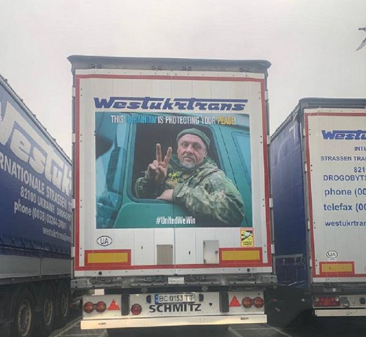 Український перевізник WestUkrTrans розмістив банери із обличчями захисників на своїх вантажівках, які курсують Європою. У наступний рейс фури вирушать зі Львова вже у неділю, 23 липня. Загалом банери наклеїли на 55 вантажівок, однак на кожній розмістили інше зображення. Окрім того, на банерах є написи англійською мовою – це послання європейцям. До прикладу, серед написів – «Ми охороняємо ваш спокій». Заступник директора компанії WestUkrTrans Михайло Піцур, що таку ініціативу запустили, щоб нагадати людям у Європі, що в Україні триває війна та спонукати допомагати ЗСУ. Вантажівки із зображеннями українських військових проїжджають чимало країн, зокрема, Польщу, Словаччину, Чехію, Німеччину, Голландію, Бельгію, Францію, Іспанію, Португалію та Італію.