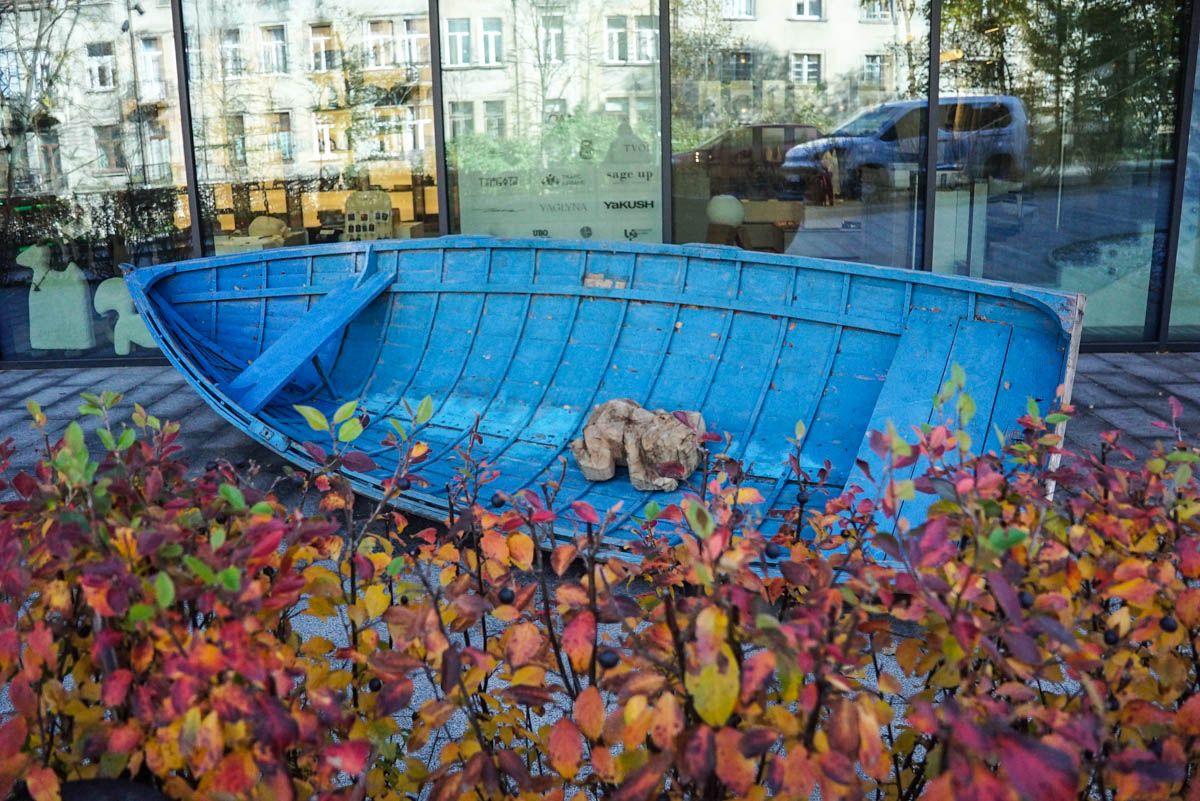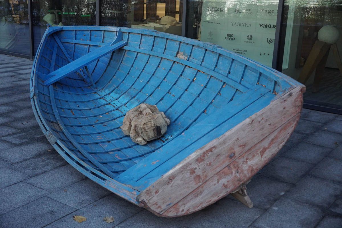 Саме робота Семківа зустрічає глядачів ще на вулиці, а синій човен у місті, якому бракує моря, нагадує про Одесу та інші приморські міста. Близькі, далекі. Та окуповані.