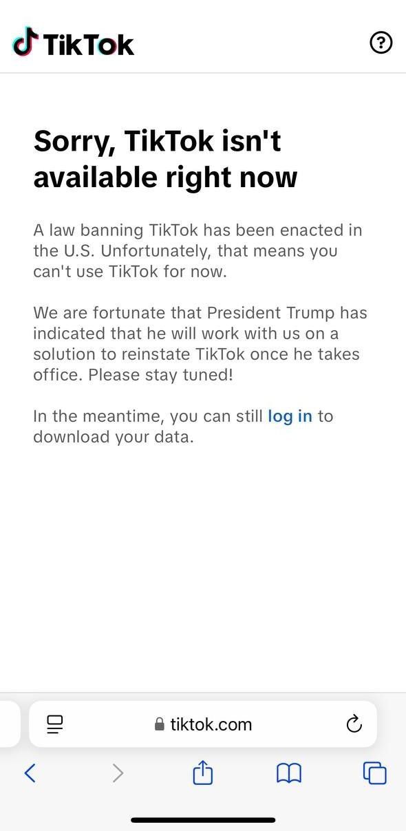 «Вибачте, TikTok зараз недоступний. У США ухвалено закон, що забороняє TikTok. На жаль, це означає, що наразі ви не можете використовувати TikTok. Нам пощастило, що президент Трамп дав зрозуміти, що працюватиме з нами над рішенням щодо відновлення TikTok, щойно вступить на посаду. Будь ласка, залишайтеся з нами», – йдеться у повідомленні в додатку.