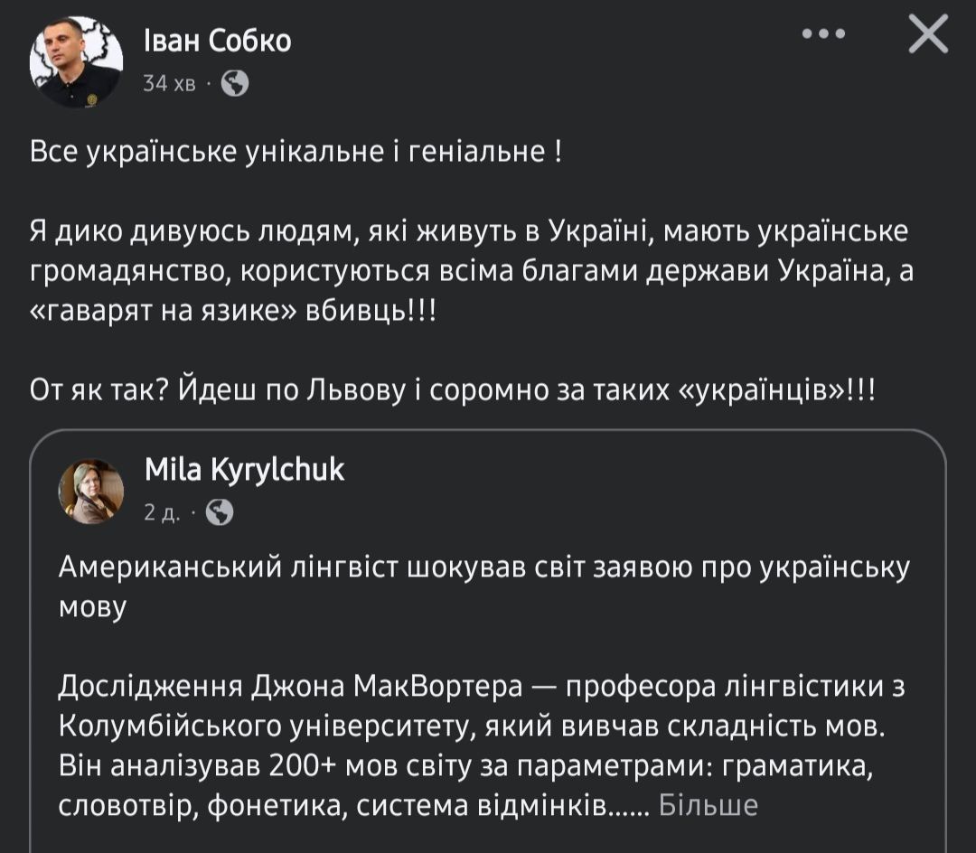 У неділю, 7 грудня, заступник голови Львівської ОВА Іван Собко на своїй сторінці у фейсбуці поширив фейк про українську мову, який ще півтора місяця тому був розвінчаний українською урядовою організацією «Центр стратегічних комунікацій та інформаційної безпеки» (Spravdi). Йдеться про «сенсаційне дослідження», яке приписали американському лінгвісту Джону МакВортеру, якого він насправді ніколи не робив, про те, що «українська мова логічніша за англійську».