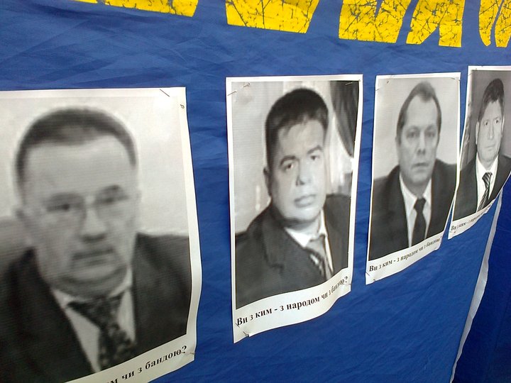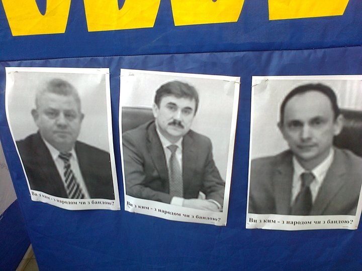 Голова Львівської ОДА Михайло Костюк та його заступники на плакатах мітингарів. Фото Гал-інфо
