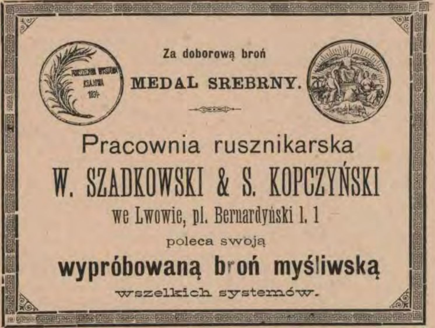 Наприкінці ХІХ – на початку ХХ століття у Львові працювало кілька майстерень зброї. Що цікаво, її продавали в самому центрі міста. Наприклад, фірма «Шадковський і Копчинський» розташувалася поруч з бернардинським монастирем й костелом. Ця зброярня мала добру репутацію і працювала на площі Бернардинській, 3 (нині – пл. Соборна). Про неї розповіли на сторінці Львівського історичного музею.
