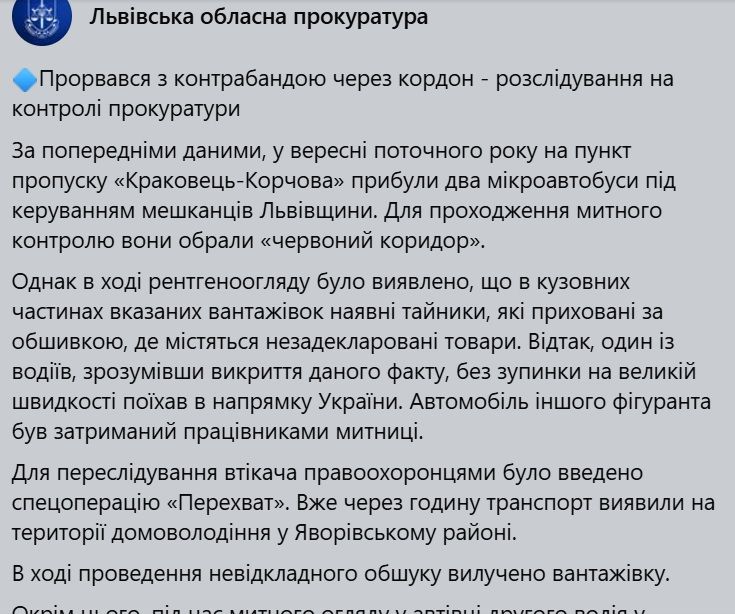 Як повідомила Львівська обласна прокуратура 9 вересня, цей випадок трапився у вересні 2025 року. У пункт пропуску «Краківець-Корчова», що на кордоні з Польщею, приїхали два вантажні авто під керуванням жителів Львівщини. Для проходження митного контролю вони обрали «червоний коридор».
