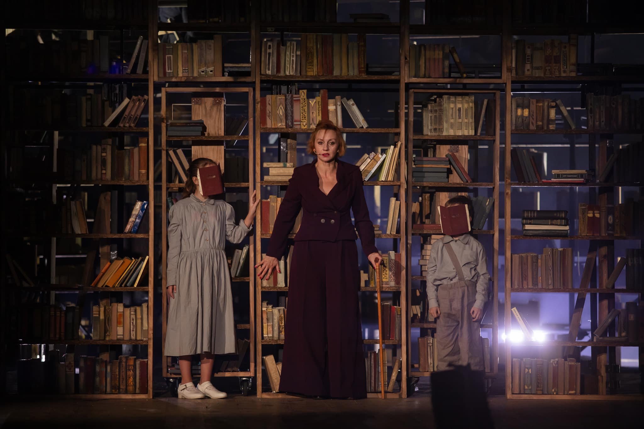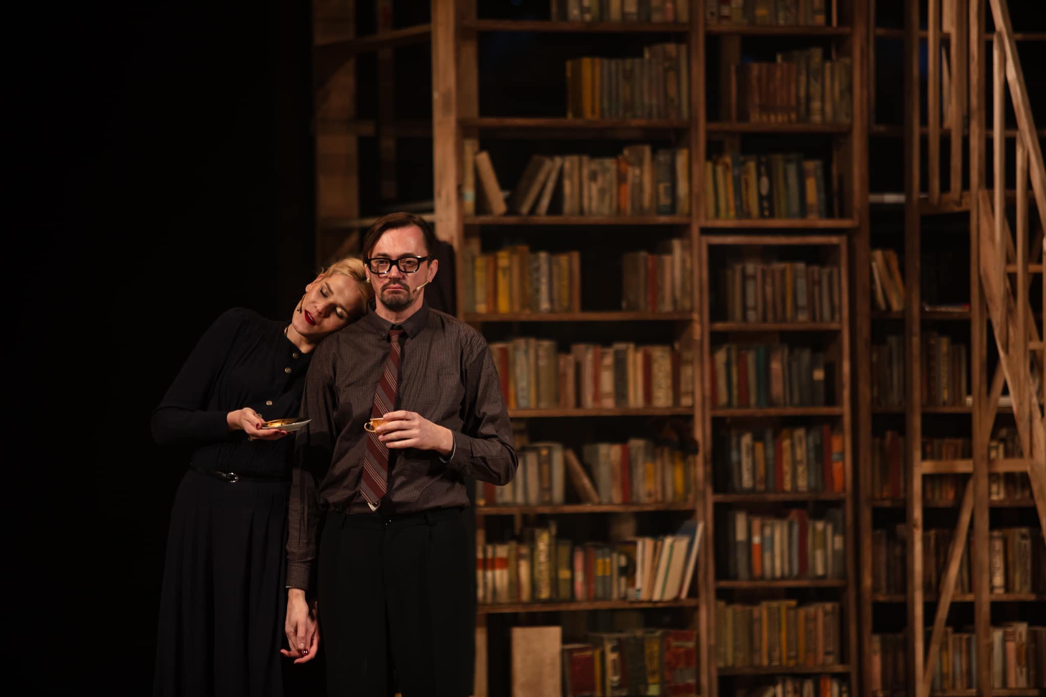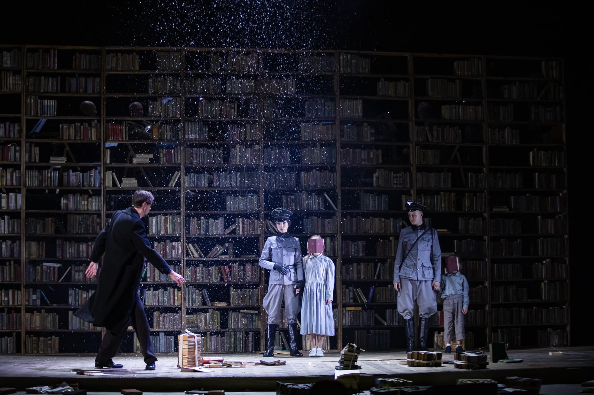 Але про все по черзі. Сценографія, вишукана та змістовно насичена, прокручує персонажів разом з усім їх досвідом знову і знову, як на каруселі. Вони обертаються, переміщаються по колу, проте насправді весь час опиняються у точці відліку. А ще вона майже повністю складається з книжок, перегукуючись з іншою новою виставою театру, «Паливо». І там, і там книжки, які ми звикли вважати символом духовного життя стають лише його формальним атрибутом, нічого не змінюючи та ні на що не впливаючи. Уся їх мудрість не має змоги протистояти варварській навалі.