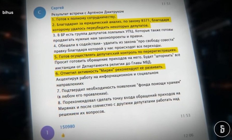 Артем Дмитрук у коментарі Bihus.info підтвердив, що зустрічався з Сергієм Чертиліним. Під час розмови, за словами нардепа, вони обговорили «захист УПЦ МП». Йшлося про законопроект Кабміну про заборону діяльності УПЦ МП на території України.