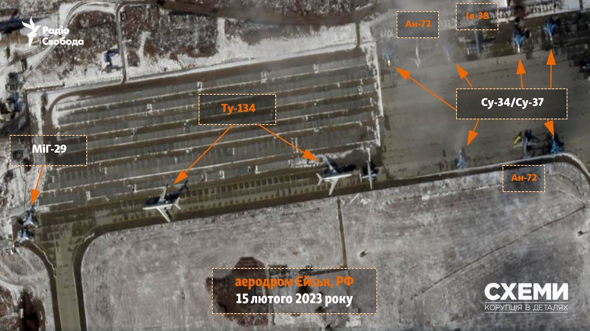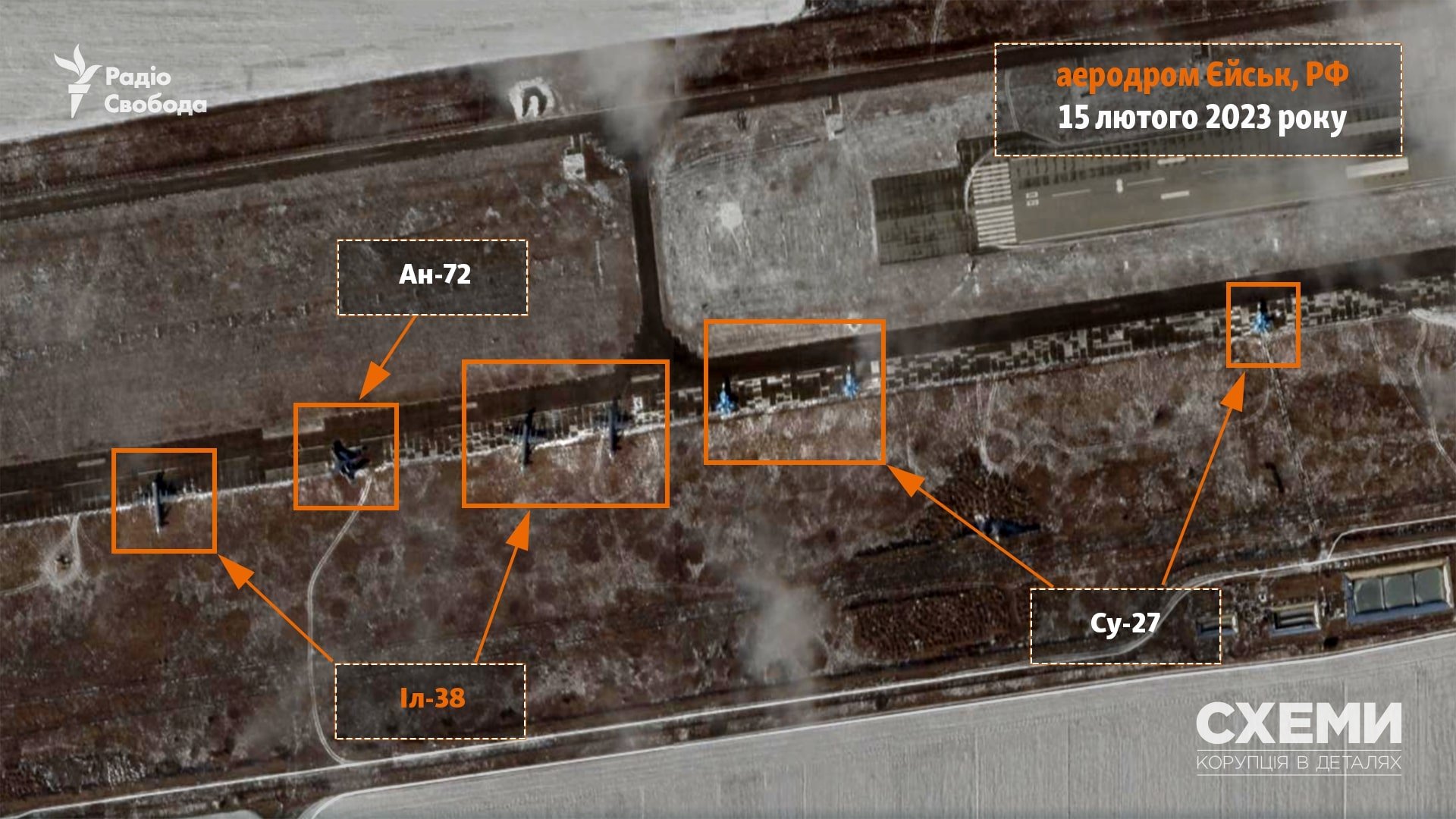 Журналісти-розслідувачі програми «Схеми» оприлюднили супутникові фотографії Planet Labs, на яких зображені наслідки пожежі на території полігону протиповітряної оборони, який розташований неподалік аеродрома у місті Єйськ Краснодарського краю Росії. 28 лютого місцеві ЗМІ та соцмережі повідомляли про атаку безпілотників на аеродром.