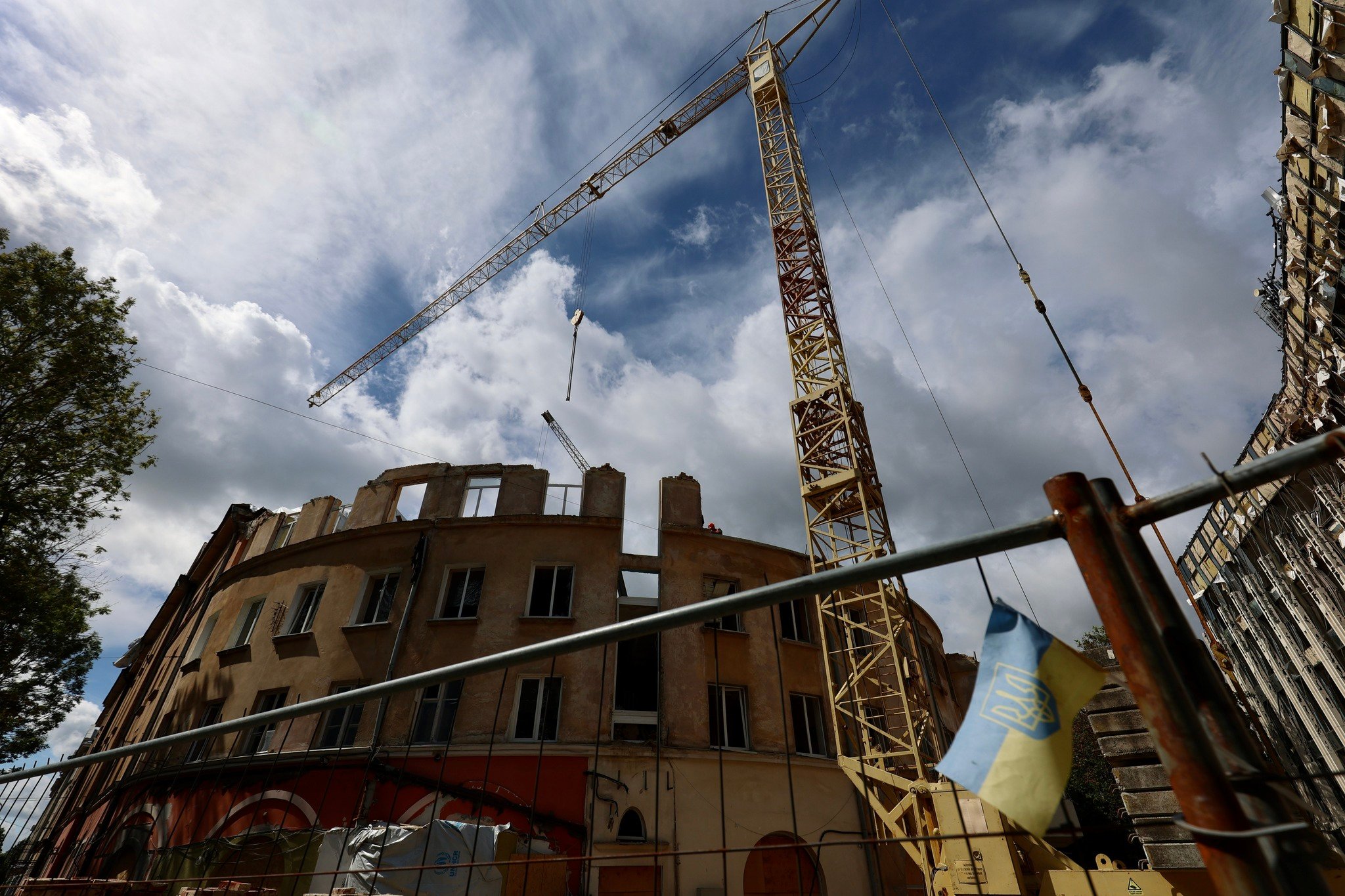 6 серпня минув місяць після влучання російської ракети в комплекс житлових будинків на вул. Стрийській у Львові. Тривають роботи з відбудови (фото із Facebook-сторінки Андрія Садового)