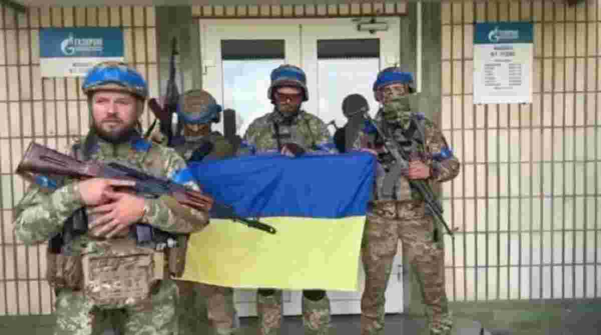 На ньому бійці у формі ЗСУ тримають український стяг біля входу у будівлю філіалу російського газового монополіста «Газпрому» у Суджі.
