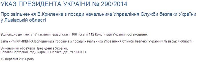 В.о. президента України Олександр Турчинов звільнив Володимира Криленка з посади начальника управління Служби безпеки України у Львівській області.