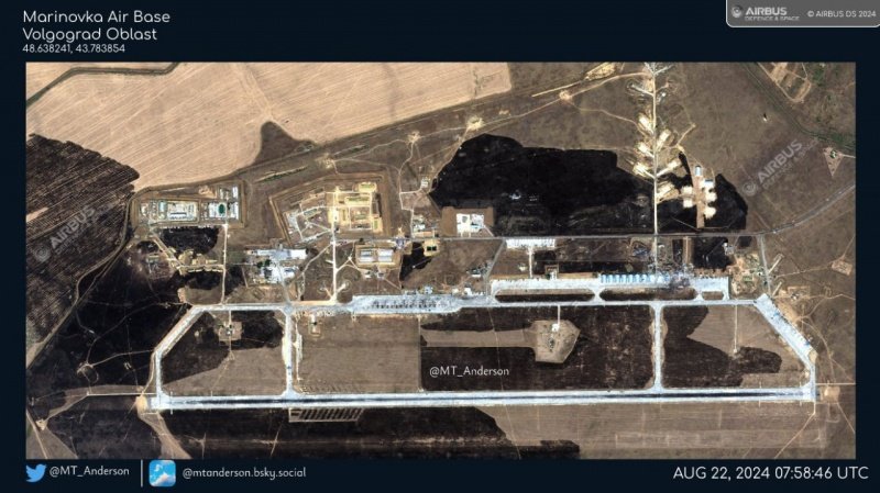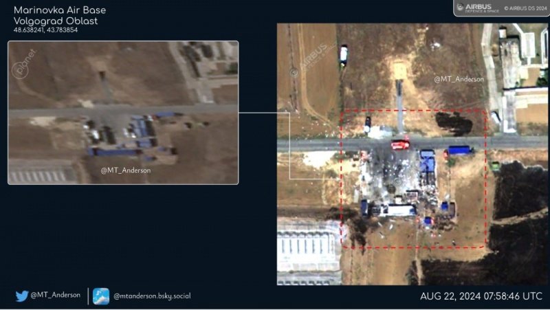 Служба безпеки спільно із Силами спеціальних операцій уразила склади з КАБами та паливом на аеродромі «Маринівка» у Росії завдавши йому значних руйнувань. Про це свідчать супутникові знімки, які у четвер, 22 серпня, оприлюднив OSINT-аналітик MT Anderson.